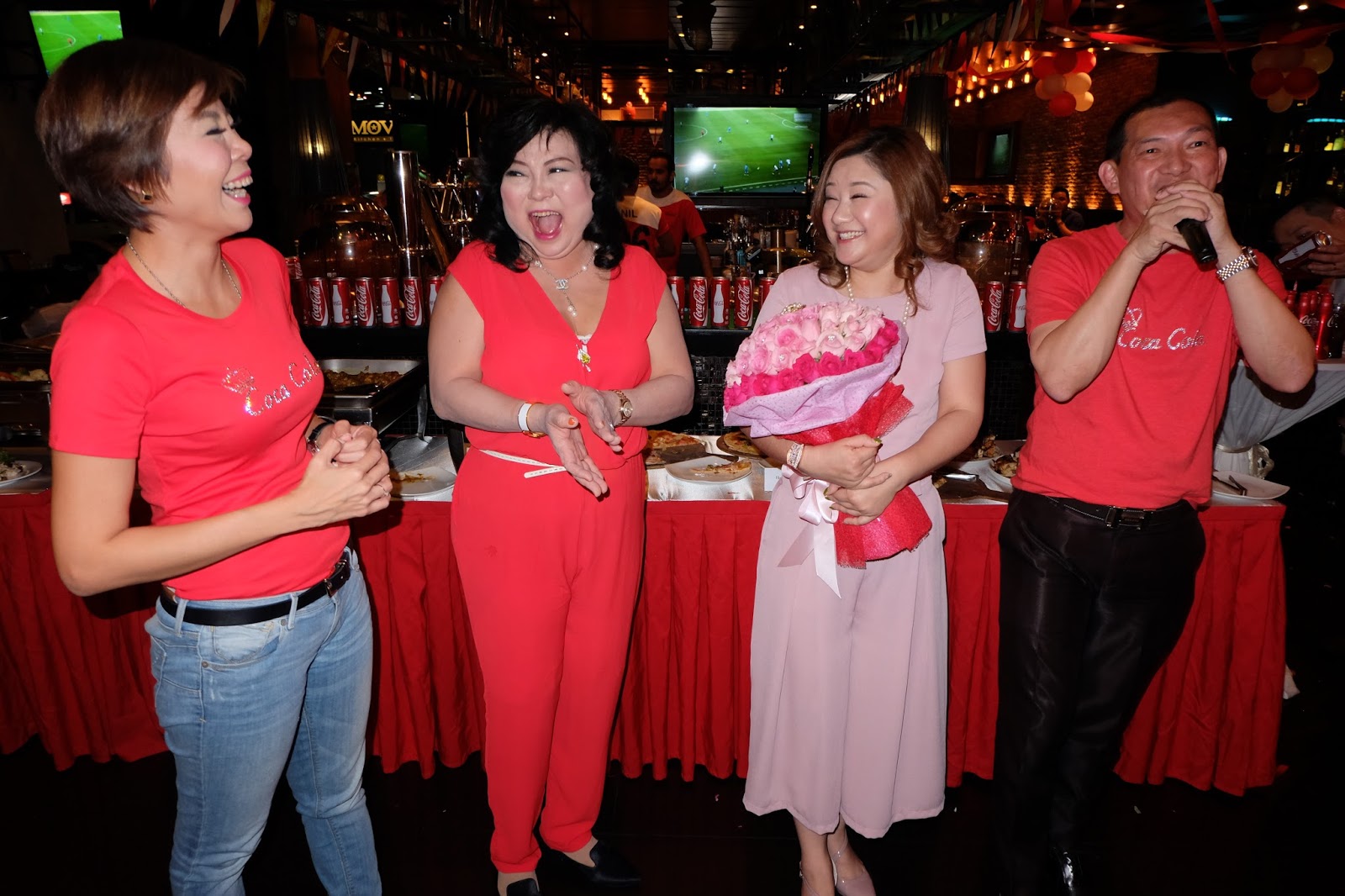 All guests were sworn to secrecy as Datin Tracy Toh simply told Datin Sharon Gan to attend a private family dinner at Movida Centrestage so the birthday girl was unaware around 50 friends were waiting for her at Movida! The theme was Coca Cola Red as this is Datin Sharon's favorite drink unlike highclass me whose favorite tipple is Dom Perignon. But lucky for hubby Dato Timothy Gan his wife has plebeian tastes or else he would be unable to maintain her expensive tastes.